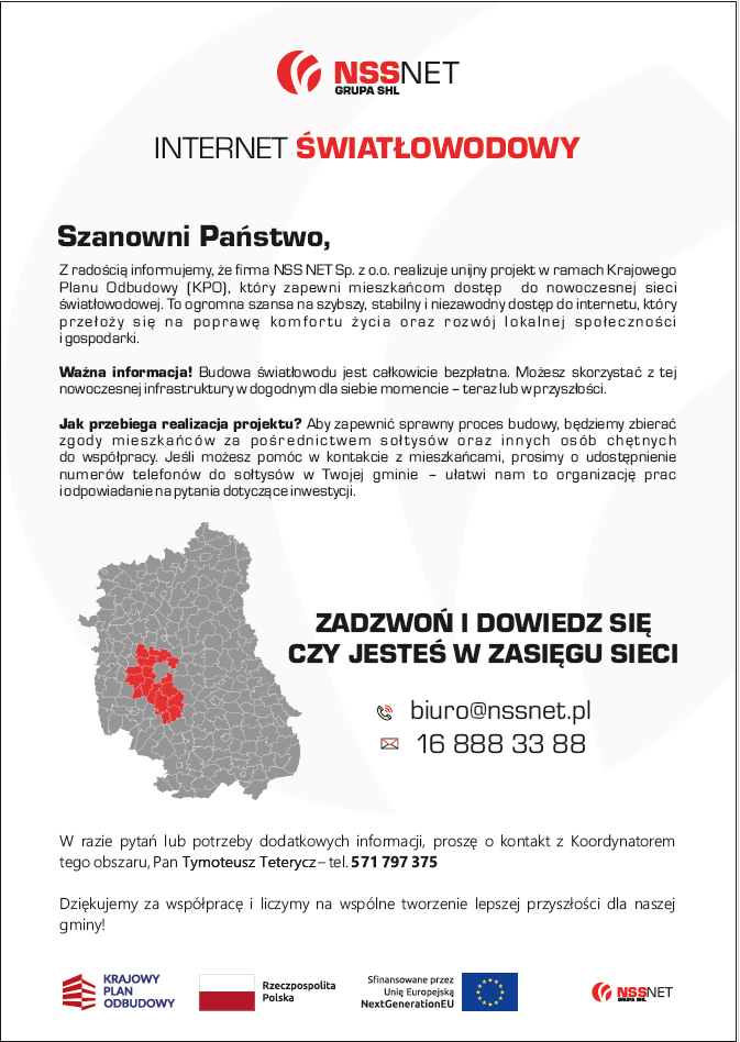 Informujemy, że firma NSS NET Sp. z o.o. rozpoczyna projekt związany z budową światłowodu na obszarze Powiatu Lubelskiego. Zachęcamy Państwa do kontaktu z Wykonawcą w celu omówienia szczegółów budowy przyłączy do konkretnych lokalizacji na terenie gminy.