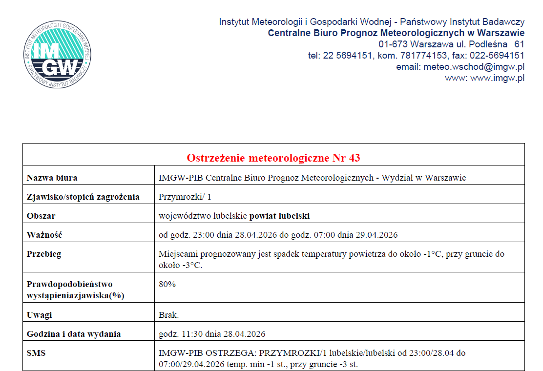 Ostrzeżenie o przymrozkach!