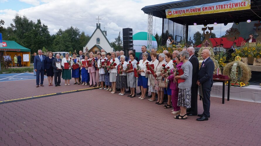 Podczas tegorocznych dożynek gminnych oprócz tradycyjnego podziękowania za pomyślne ukończenie żniw oraz prac w polu świętowaliśmy również wyjątkowy jubileusz - złote gody naszych mieszkańców. W trakcie uroczystości 16 par małżeńskich zostało uhonorowanych medalem za długoletnie pożycie małżeńskie, przyznawanym przez Prezydenta RP.