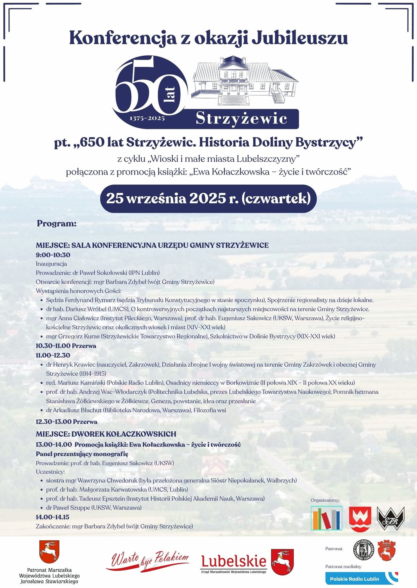 25 września 2025 r. odbędzie się konferencja z okazji jubileuszu 650-lecia Strzyżewic pt. „650 lat Strzyżewic. Historia Doliny Bystrzycy”. W programie znajdą się wystąpienia historyków, regionalistów oraz promocja książki „Ewa Kołaczkowska – życie i twórczość”. Serdecznie zapraszamy do udziału w tym wyjątkowym wydarzeniu.