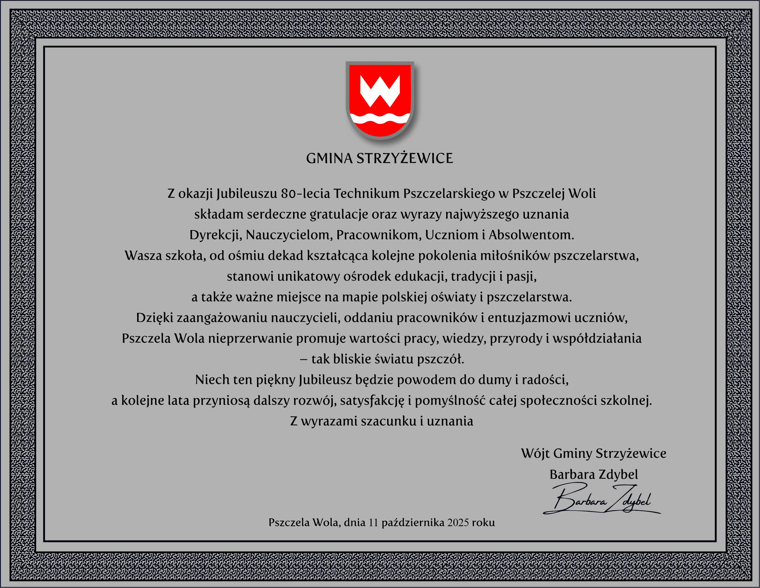Gminę Strzyżewice reprezentowała Wójt Barbara Zdybel, która złożyła gratulacje i wyrazy uznania dla całej społeczności szkolnej, podkreślając jej zasługi w kształceniu pszczelarzy oraz rozwoju gminy. Wójt wręczyła również pamiątkowy grawer upamiętniający jubileusz 80-lecia szkoły.
