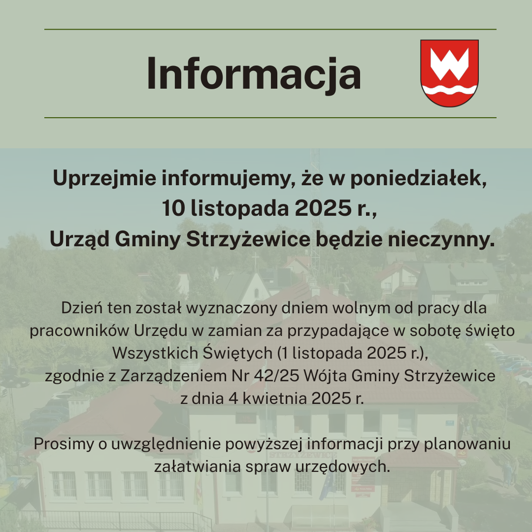 Uprzejmie informujemy, że w poniedziałek 10 listopada Urząd Gminy Strzyżewice będzie nieczynny