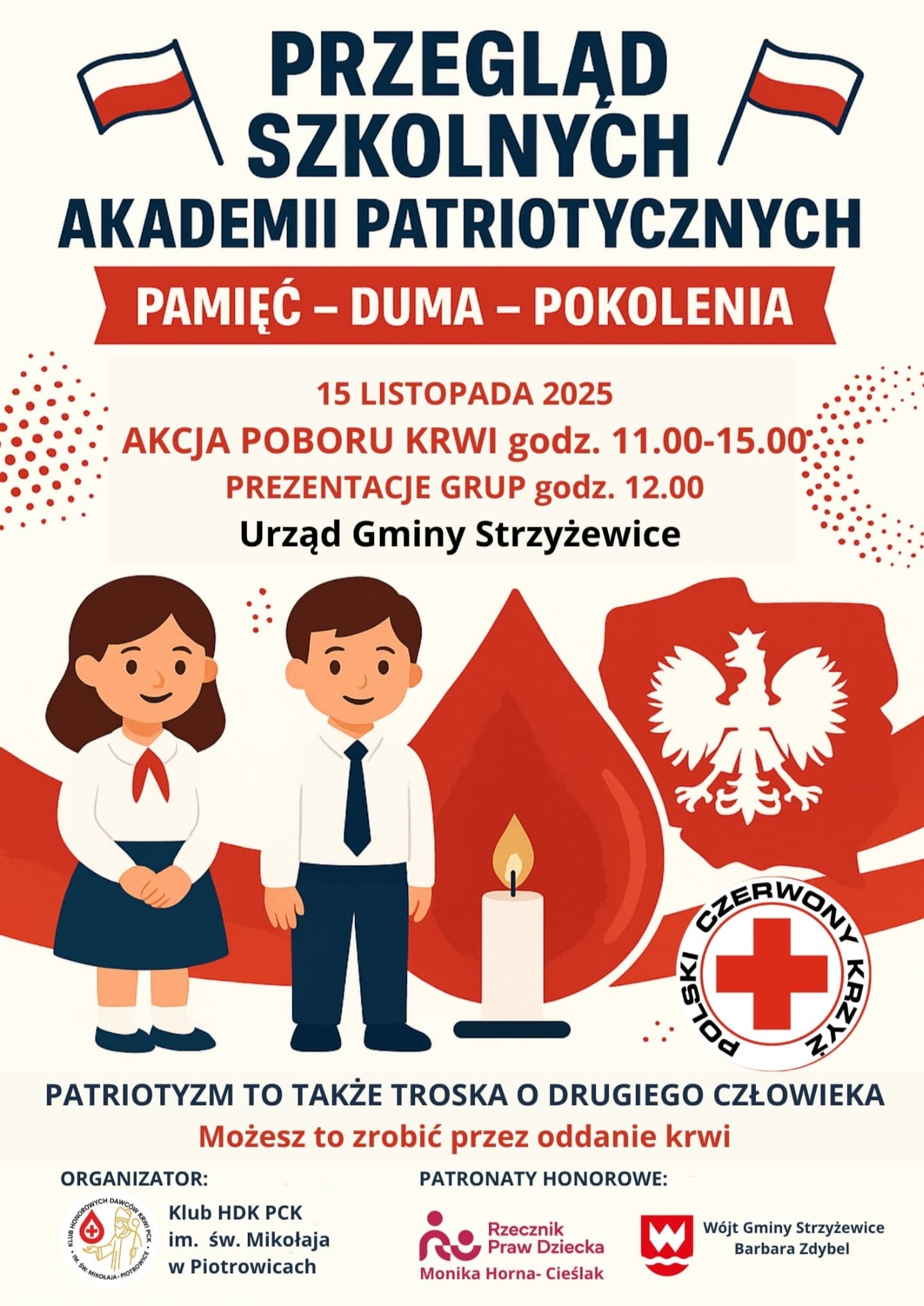 Wójt Gminy Strzyżewice Barbara Zdybel oraz Klub Honorowych Dawców Krwi PCK im. św. Mikołaja w Piotrowicach serdecznie zapraszają na Przegląd Szkolnych Akademii atriotycznych pod hasłem „Pamięć – Duma – Pokolenia”, połączony z akcją honorowego krwiodawstwa.