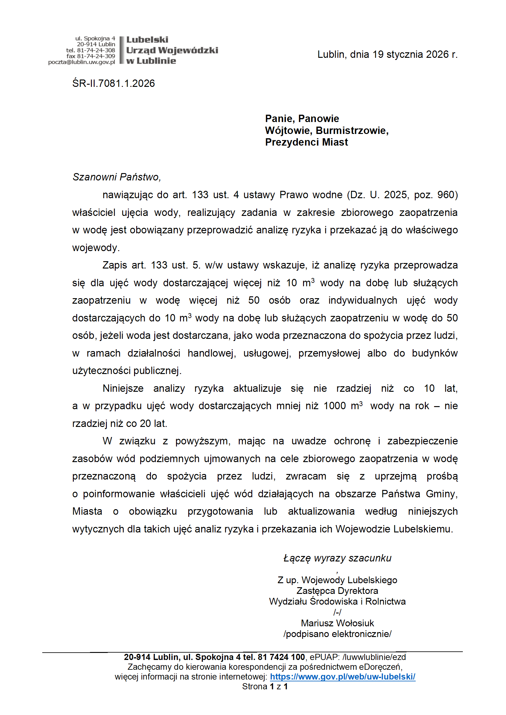 Wojewoda Lubelski przypomina o konieczność opracowania analizy ryzyka dla studni (ujęć wody) o wydajności powyżej 10m3/dobę - obowiązek nie jest wymagany dla mieszkańców domów jednorodzinnych. Kontakt: Lubelski Urząd Wojewódzki w Lublinie tel.: 817424308:
