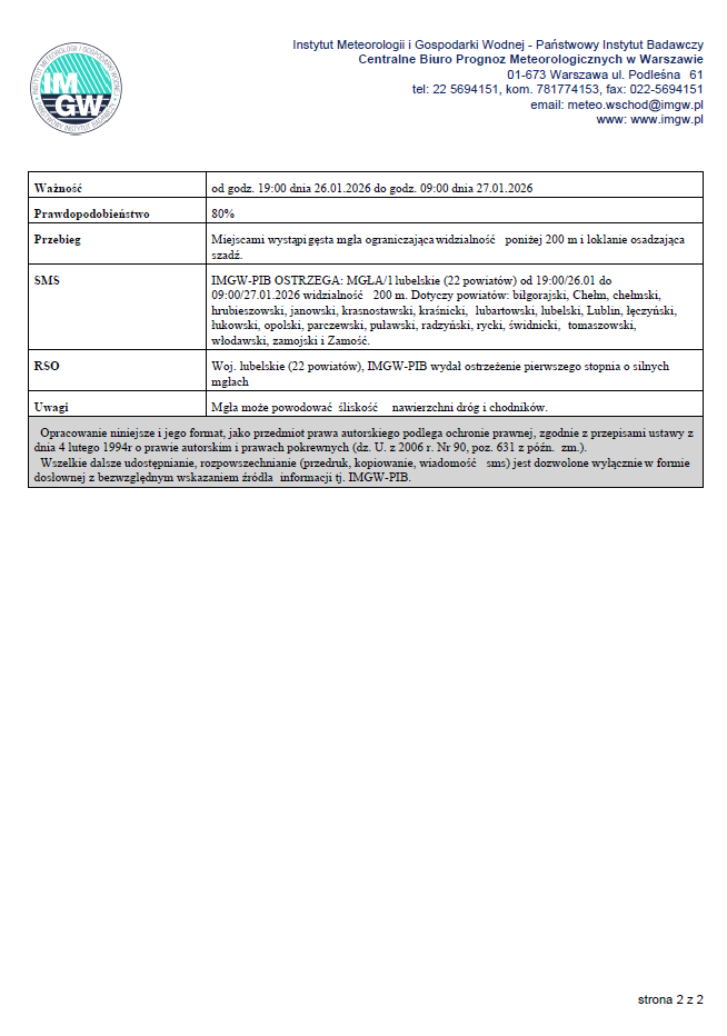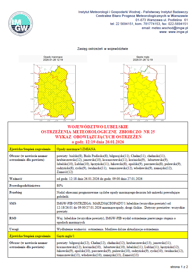 Uwaga! Opady marznącego deszczu lub mżawki powodujące gołoledź.