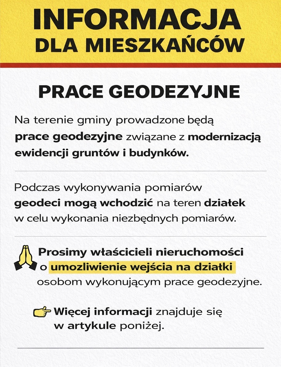 Informując o powyższych czynnościach, zwracam się z uprzejmą prośbą do właścicieli, użytkowników wieczystych oraz władających nieruchomościami na tym terenie o czynny udział w realizacji prac oraz o umożliwienie wykonywania czynności geodezyjnych.