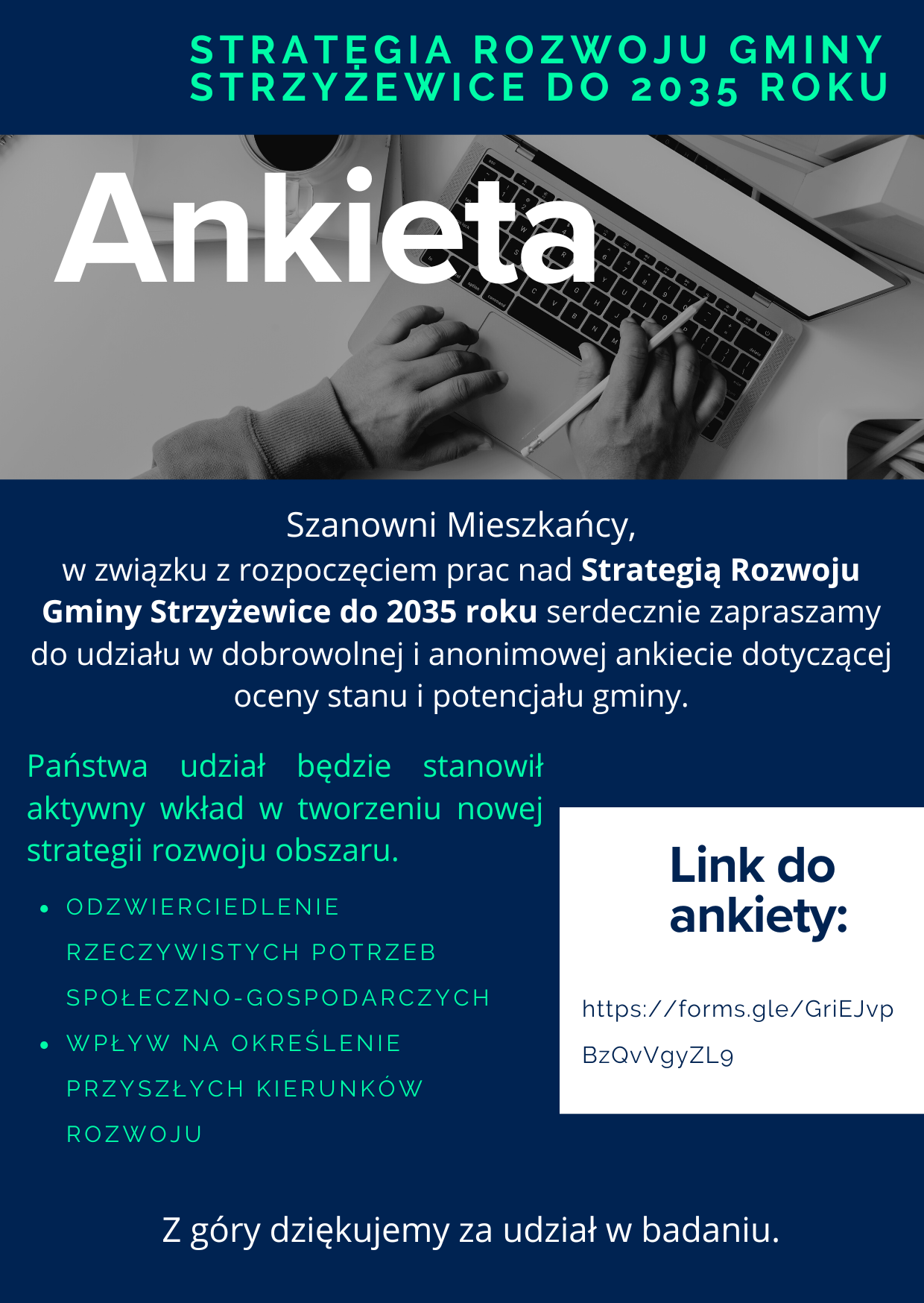 w związku z rozpoczęciem prac nad dokumentem pt. Diagnoza sytuacji społecznej, gospodarczej, przestrzennej i klimatyczno-środowiskowej Gminy Strzyżewice, który będzie stanowić podstawę do opracowania Strategii Rozwoju Gminy Strzyżewice do 2035 roku uprzejmie prosimy o wypełnienie przeznaczonej dla Państwa ankiety dotyczącej oceny stanu i potencjału gminy.